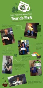 Since this community we live and drink coffee in is so supportive and well caffeinated, we decided to celebrate our first anniversary by giving back to our customers. Lucky Perk turned one year old this February and we celebrated all the way up to St. Patrick’s Day with an event called Tour de perk. Each customer was asked to participate in Tour de Perk by visiting four out of our six Lucky Perk locations around Meridian, Boise and Mountain Home. Tour de Perk ran for six weeks with each Monday featuring a different Lucky Perk location serving Lucky Dollar Deals ($1 – 12oz, $2 – 16oz, $3 – 20oz). Each location stamped the back of a customer’s coffee card until they had four stamps on the back, then the customer was entered into the drawing. On St. Patrick’s Day (our favorite day of the year), we picked seven winners from EACH location! Here is a list of what our customers could win: